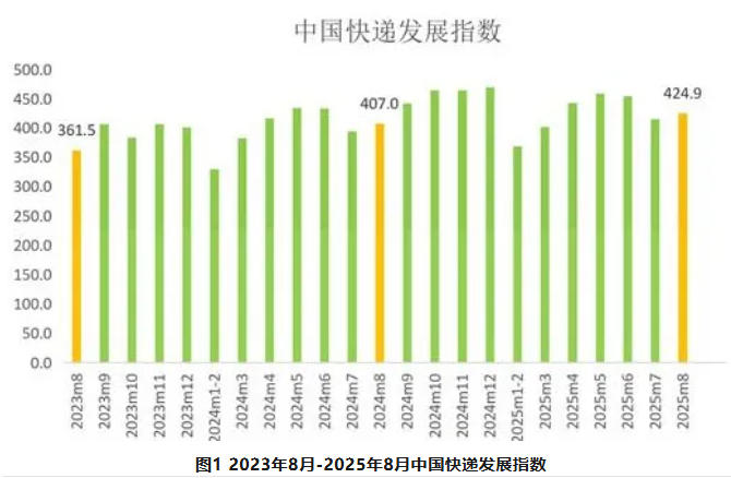 经测算,2025年8月中国快递发展指数为424.9,同比提升4.4%。其中发展规模指数、发展趋势指数分别为567.4和71,同比分别提升11.2%和10.4%。服务质量指数、发展能力指数分别为605.1和220,与去年同期基本持平。8月,快递业市场规模稳步拓展,综合运能不断提高,航空网络加快完善,行业与上下游产业紧密融合,有力支撑经济平稳运行。
